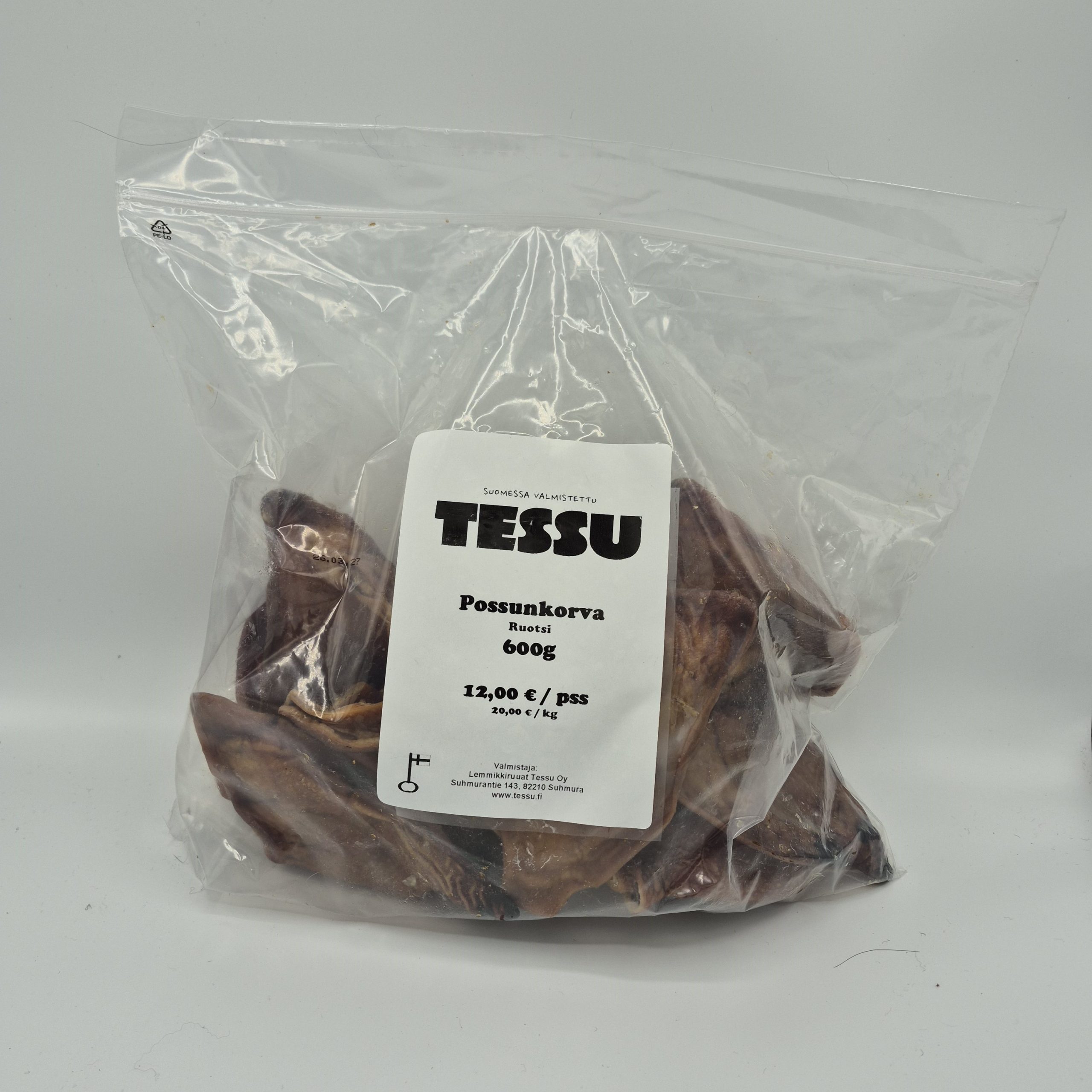 Tessu possunkorva on tuttu ja turvallinen paistettu herkku! Possunkorva on miedolla lämmöllä kuivaksi paistettu herkullinen makupala, joka käy kaikenkokoisille ja -ikäisille koirille. Kuivattujen lemmikkien makupalojen ehdoton suosikki! Suuren energiapitoisuuden vuoksi possunkorvat ovat mainio lisäenergian lähde koirille joilla on kova kulutus, esim. työkoirat ja rekikoirat.